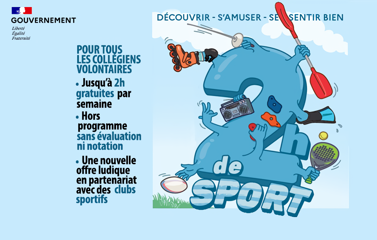 Le dispositif « 2 heures de sport en plus par semaine pour les collégiens » (2HSC), vient compléter ces dispositifs pour les collégiens, qui connaissent un décrochage significatif de la pratique sportive.